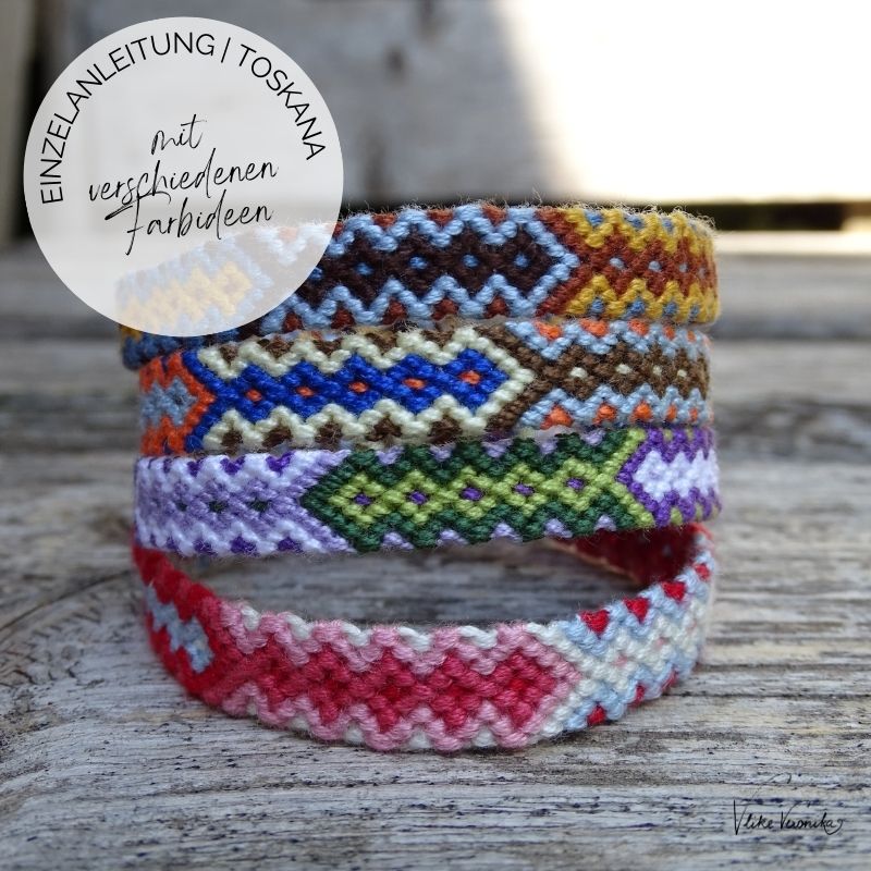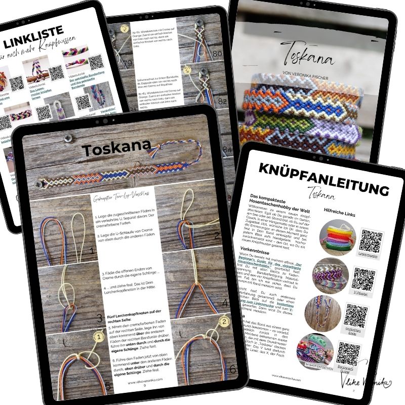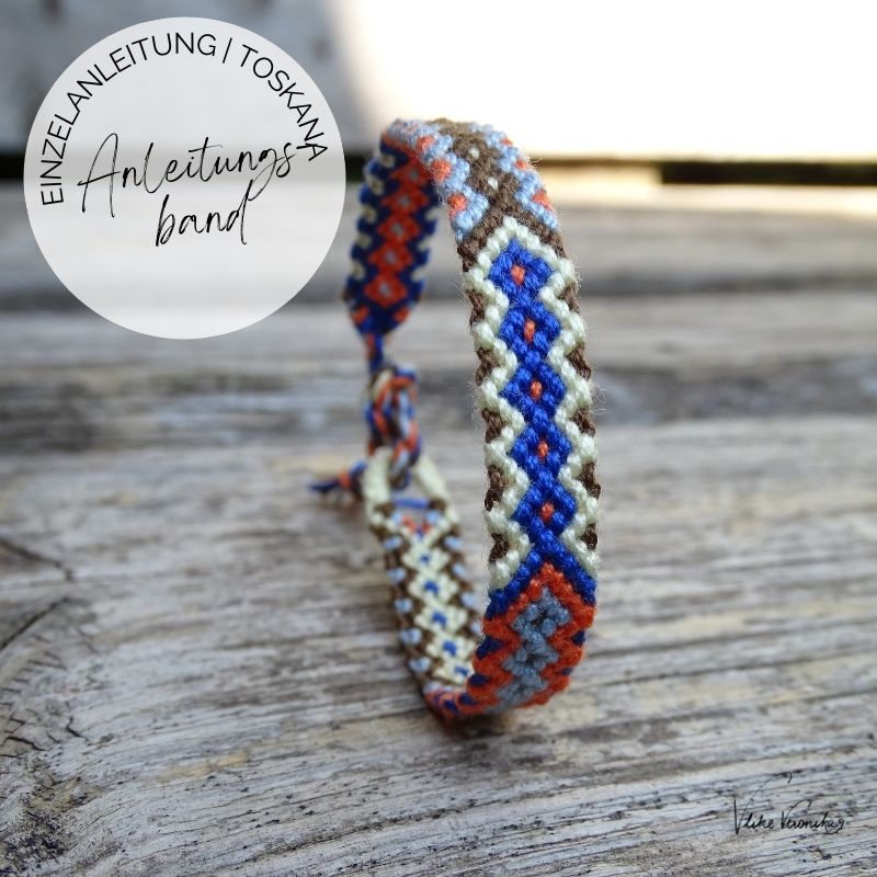 Du solltest vorher das Linienmuster und das V-Muster beherrschen. Die Anleitungen für diese beiden Muster sind kostenlos am Blog als PDF und als Videoanleitung verfügbar, aber auch in etwas erweiterter Fassung im 1. eBook enthalten. Im Muster Toskana kommen viele Wendeknoten vor, daher ist etwas Knüpfroutine von Vorteil.